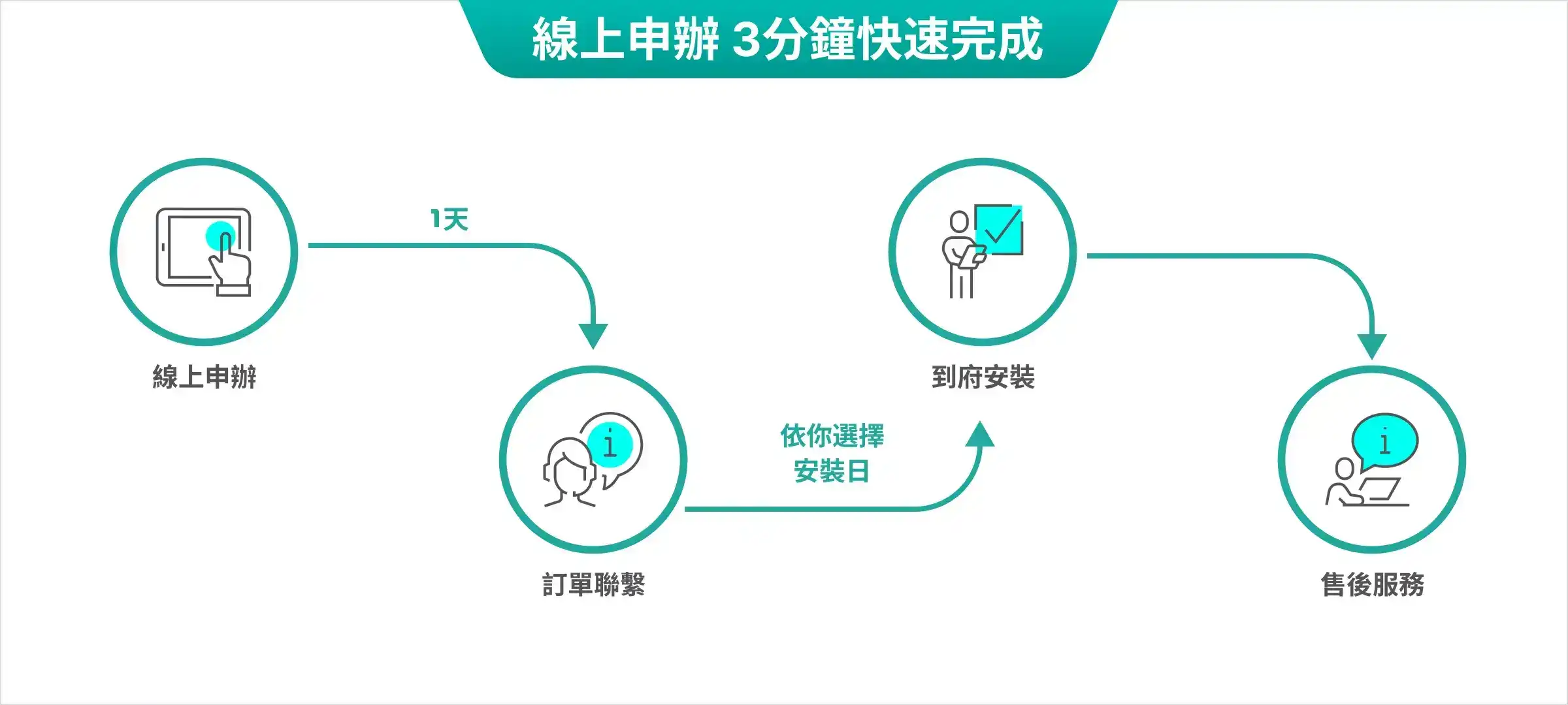 網路門市申辦流程要多久?申辦後隔日,會有專人與你聯繫確認安裝日期;申辦時可自由預約2~14天後的安裝日期。如欲查詢申裝進度可至官網登入會員查詢申辦進度。