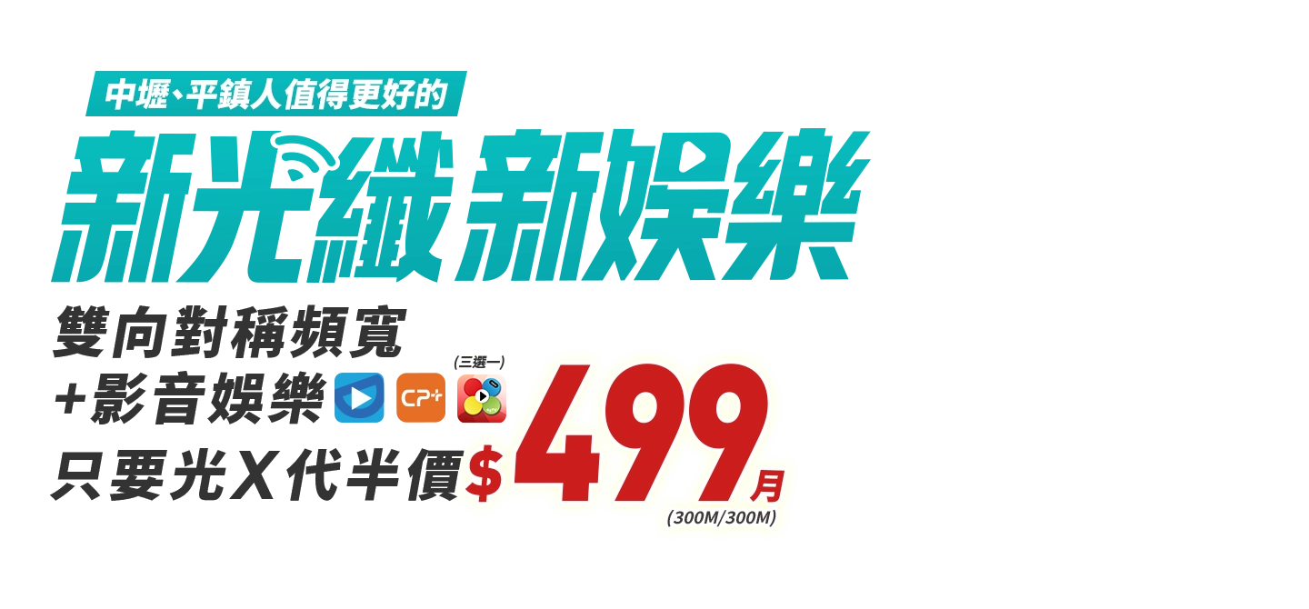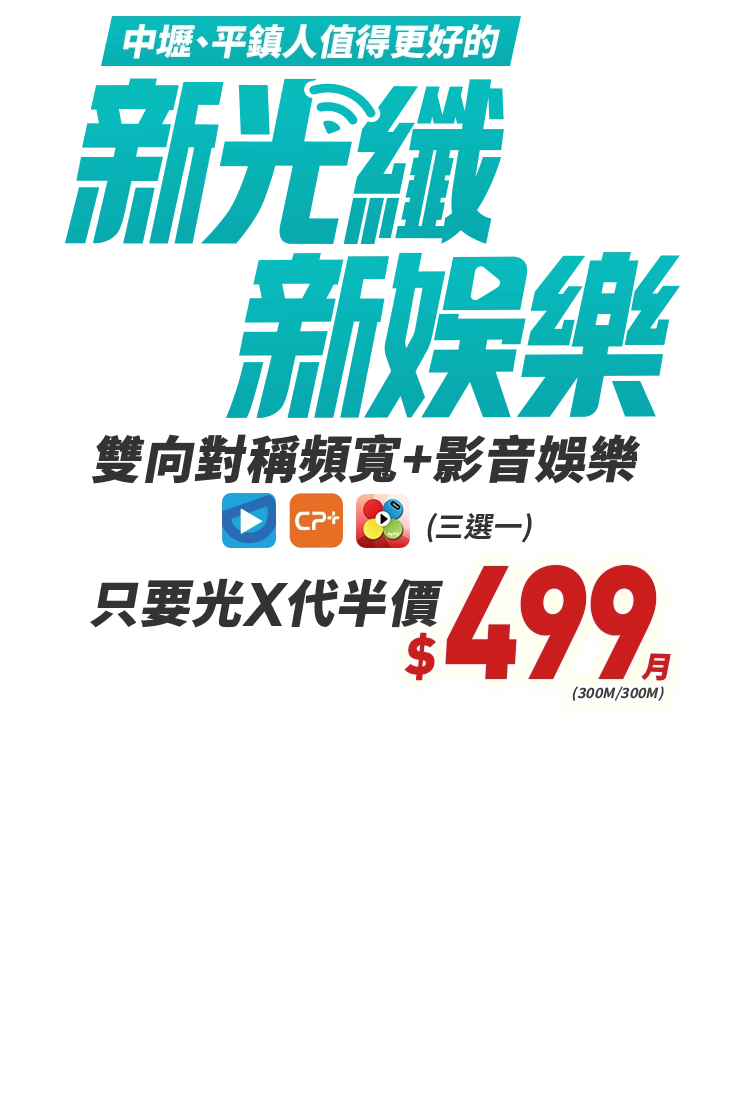 *戶戶獨享雙向對稱頻寬:需符本公司光纖到府及雙向對稱頻寬光纖上網方案供裝資格。只要光X代半價(限指定方案與資格):與同為光纖到府技術之同業相較,符合本活動資格新申辦300M/300M光纖上網方案,本公司月租$499而為光X代$999(此係參考115/3/17同業官網公告同速率方案之價格)的半價。