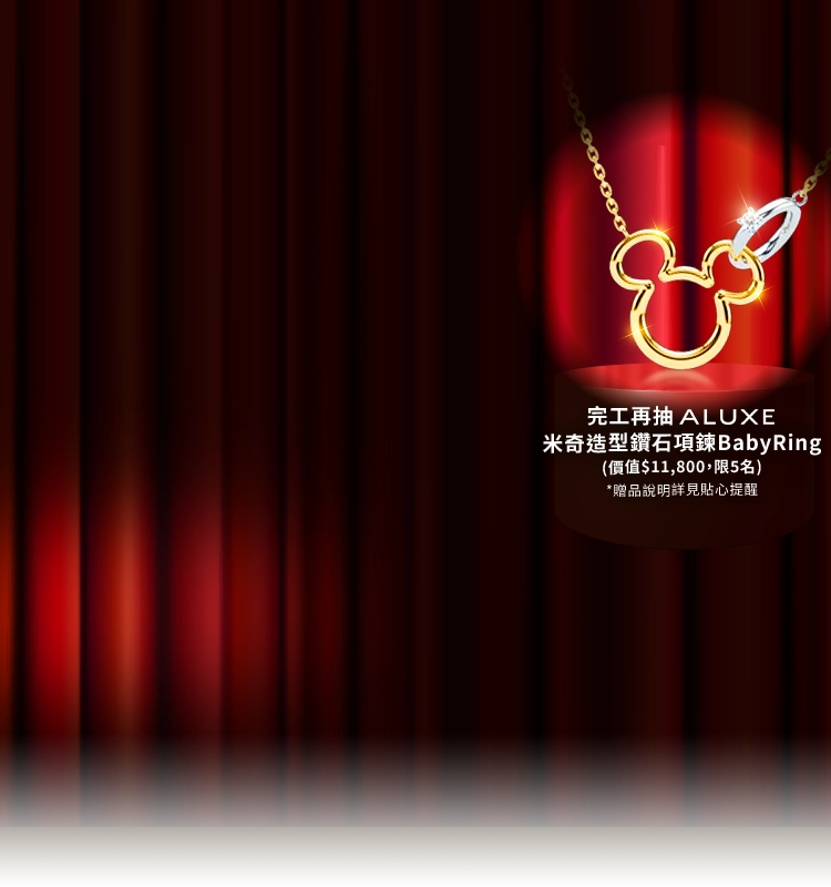 5.贈獎時間:預計於收到中獎人之機會中獎回覆函後一個月內(以郵戳為憑)寄送「經典米奇系列|亞立詩米奇造型 BabyRing 鑽石項鍊」至中獎回覆函所載之通訊地址。