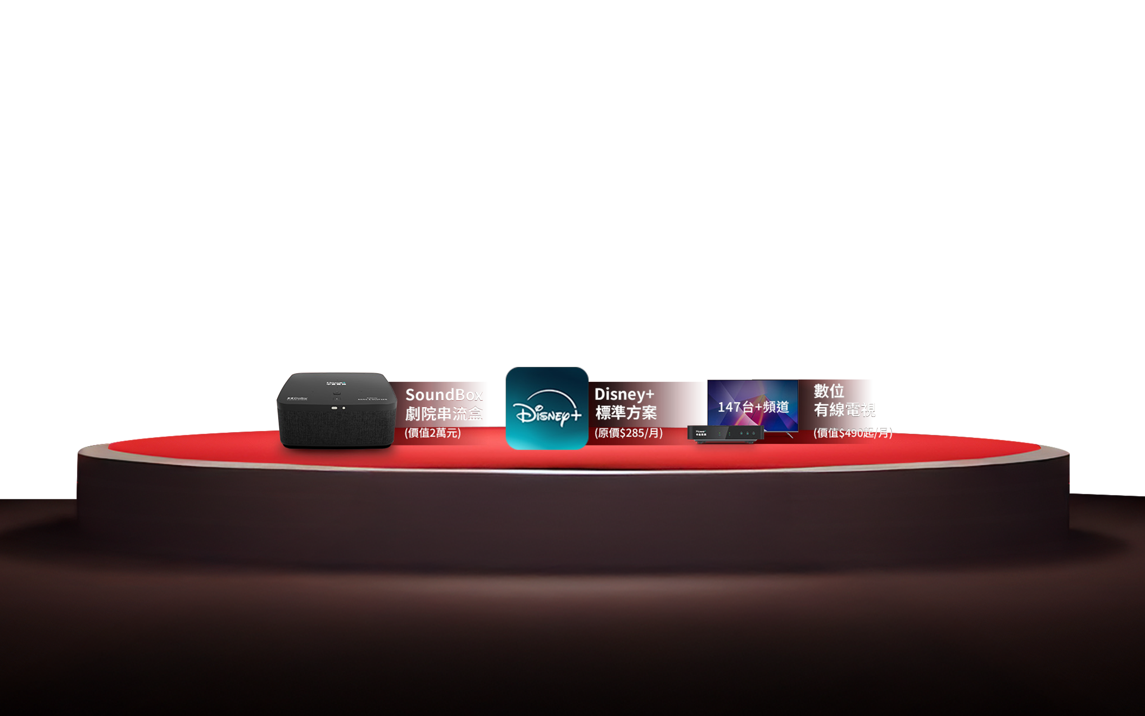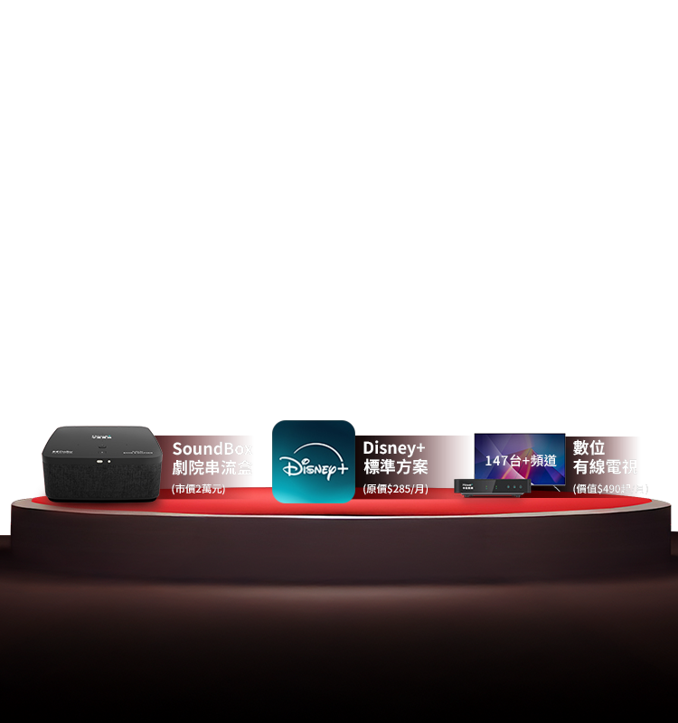 2.本專案享光纖上網服務36個月,另享:(1) SoundBox劇院串流盒36個月每月月租費0元(享免費安裝、檢修及保固服務,惟SoundBox設備若因人為因素造成損毀、故障或遺失者則需照價賠償,且於本專案終止或將本專案變更為未搭配SoundBox之專案時,SoundBox設備須拆機繳回) (2)「Disney+標準方案36個月請你看」優惠(綁約期間屆滿後,未主動申請取消Disney+ 服務(標準或高級方案)者,視為同意繼續使用本服務並依續用時月租型Disney+服務(標準或高級方案)之原價計費)。限同址及同申裝人於光纖上網及有線電視申裝使用期間收視使用。恕不得延期、兌換、轉贈或轉用於其他服務。套餐頻道別依中嘉寬頻規劃或頻道商實際授權期間為準,恕不就特定頻道組合及內容為保證。
